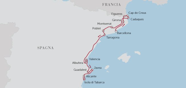 Costa Brava, Costa Dorada, Costa del Azahar e Costa Blanca: 750 km di litorale, da Girona ad Alicante, fatto di spiagge di sabbia fine e dorata, affacciate su uno splendido e poco profondo Mar Mediterraneo e baciate dal sole e da un clima mite durante tutto l’anno. Nell’entroterra ampie valli si alternano a monti ricoperti da vigneti, noccioli e mandorli e costellate da siti di grande bellezza, ricchi di storia, tradizioni e artigianato.